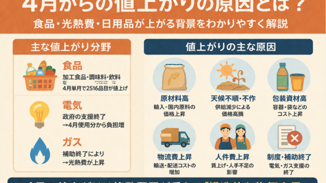 4月から値上がりが目立つのはなぜなのか。食品、電気、ガス、日用品が上がる背景を、原材料高・物流費・人件費・制度変更などの視点からわかりやすく解説します。