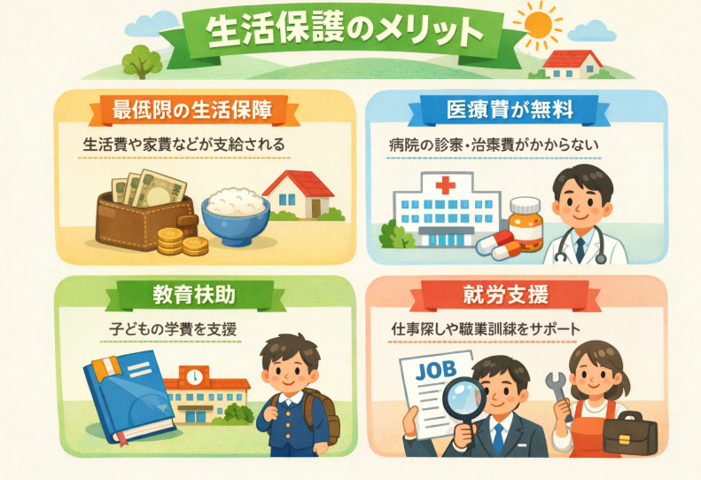 生活保護の最大のメリットは、生活の土台を失わずに済む可能性が高まることにある。食費、住居費、医療費など、生活の中核部分が制度上支えられるため、生活破綻を防ぎやすい。特に医療扶助があることは大きく、病気やけがで収入が減った人が、治療費の不安からさらに状態を悪化させる悪循環を断ちやすい。