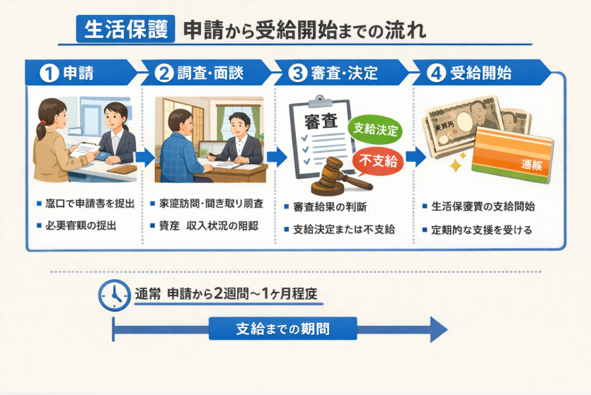 生活保護を受けたい場合は、住んでいる自治体の福祉事務所に相談し、申請を行う。申請後、福祉事務所は訪問調査や資産調査などを行い、保護の要否や支給額を審査する。厚生労働省の案内では、原則として申請から14日以内に受けられるかどうかを判断するとされている。