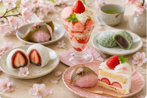 4月の食事を考えるとき、主菜や主食ばかりに意識が向きやすいが、デザートや甘味も季節感を作る大きな要素である。いちごパフェ、いちご大福、桜もち、桜ゼリー、よもぎ餅、春のフルーツタルトなどは、4月らしさをわかりやすく表現できる。特に桜やいちごは、春を象徴する存在として多くの人に共有されており、料理全体の印象を明るくする力がある。