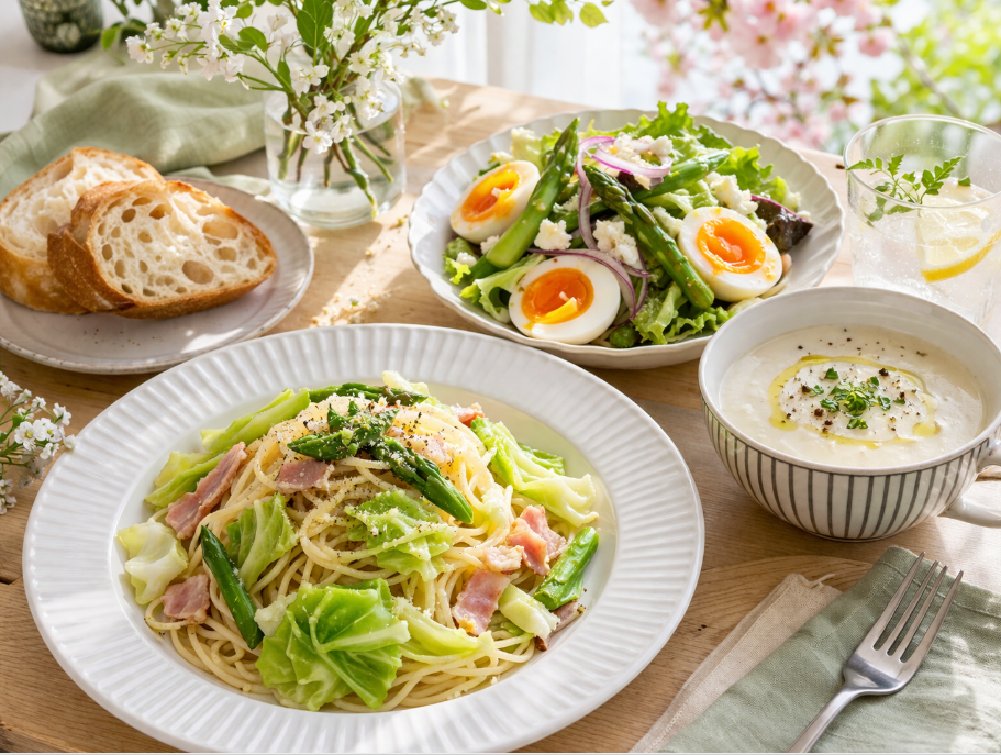 一方で、現代の食生活では和食だけが選択肢ではない。4月の旬食材は洋食にも応用しやすく、忙しい日常の中ではむしろ洋食やワンプレートの方が取り入れやすい場合もある。春キャベツとベーコンのパスタ、新じゃがのグラタン、新玉ねぎのスープ、アスパラと卵のサラダ、菜の花とベーコンのペペロンチーノ、しらすのピザ、春野菜のキッシュなどは、春らしさと日常の食べやすさを両立しやすい。